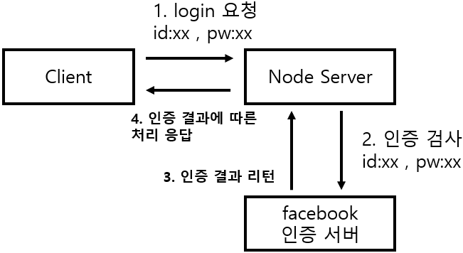만약 facebook 로그인 api를 사용한다면 사용자가 나의 웹서버에 인증을 요청하는 경우 나의 node 웹 서버에서 facebook으로 인증 api 요청을 날리게 되고 facebook 인증 서버에서는 인증에 대한 결과를 리턴하는데 이때 나의 node 서버는 facebook 인증 서버로부터 웹 클라이언트로 동작한다고 할 수 있습니다.
