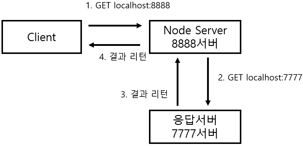 7777서버는 결과를 응답하고 8888서버는 7777서버에 응답받은 결과를 그대로 Client에게 응답하게 됩니다.