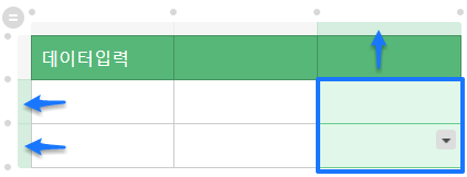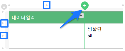 행과 열을 추가하는 첫 번째 방법으로는 셀 구분선 위의 점에 마우스를 올려두면 + 모양의 아이콘이 나타나는데 이것을 클릭합니다.