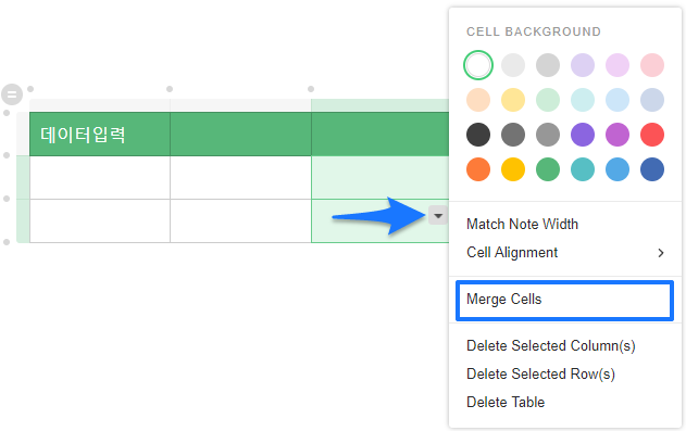 - 화살표 버튼을 누른 후 Merge Cells 를 클릭합니다.