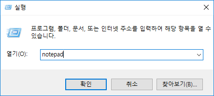 Windows 시작 버튼 + R 을 누른후 notepad를 입력해 실행하거나, 시작 메뉴에서 메모장을 클릭해 실행합니다.