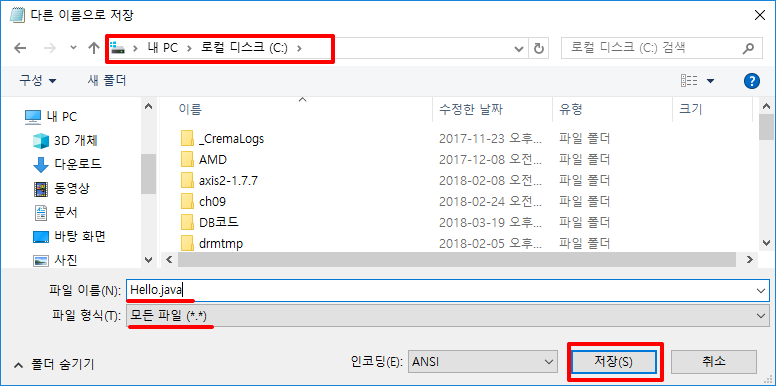 작성된 소스를 Hello.java 라는 이름으로 C 드라이브 바로 하위에 저장합니다.