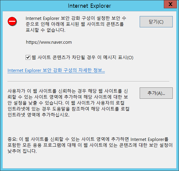 Internet Explorer 보안 강화 구성이 설정한 보안 수준으로 인해 아래에 표시된 웹 사이트의 콘텐츠를 표시할 수 없습니다.