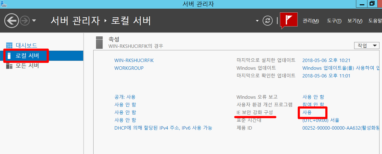 로컬 서버 > IE 보안 강화 구성 > 사용 클릭