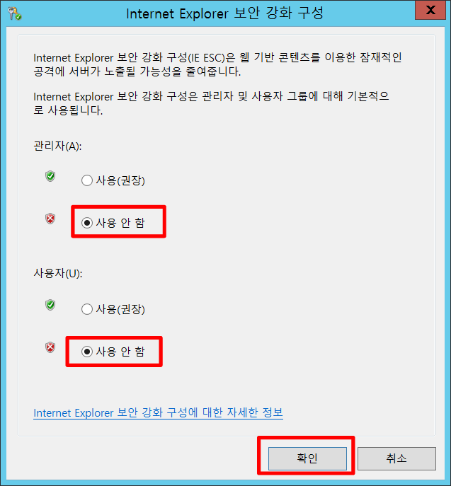 Internet Explorer 보안 강화 구성 팝업이 나타나면 관리자와 사용자 모두 사용 안함 설정으로 바꾸고 확인을 누릅니다.