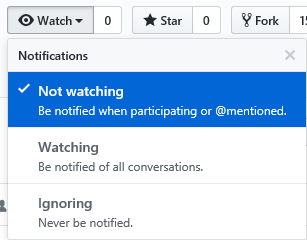 Watch : 버튼을 클릭하면 현재 저장소의 활동 내역을 사용자에게 알려줍니다. 알림에는 세 가지 방식이 있는데 Ignoring은 모든 알림을 무시하며, 반대로 Watching은 모든 활동 내역을 알려줍니다. 마지막으로 No Watching은 댓글이나 Issue 등에서 언급될 때에만 알려주며 세 방식 중 하나를 선택할 수 있습니다.