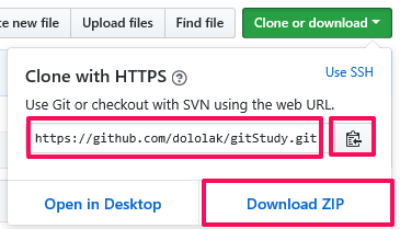 Clone or Download : 저장소를 Clone하거나 압축파일 형태로 다운로드 합니다. 이 버튼을 클릭하면 아래와 같이 나타나는데, 현재 Git 저장소의 주소가 나타나 있습니다. 이것을 직접 복사하거나 그 옆의 복사 버튼을 클릭하면 클립보드에 복사되고 git clone 명령어로 저장소를 로컬 저장소에 가져올 수 있습니다. Download ZIP을 누르면 저장소의 파일들이 압축파일 형태로 다운로드 받아집니다.