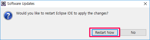 Restart Now 클릭. 플러그인을 적용하기 위해 이클립스가 재시작됩니다.