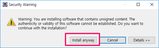 보안 관련 경고가 나타나는데, 플러그인 설치시마다 나타나는 경고이므로 Install anyway를 클릭합니다.