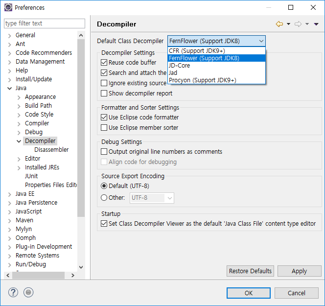 Java -> Decompiler 탭에 접근하면 설치한 디컴파일러 플러그인에 대한 설정을 할 수 있습니다. 디컴파일러 종류를 바꾸거나 디컴파일된 소스 표기 방법등을 설정할 수 있습니다.