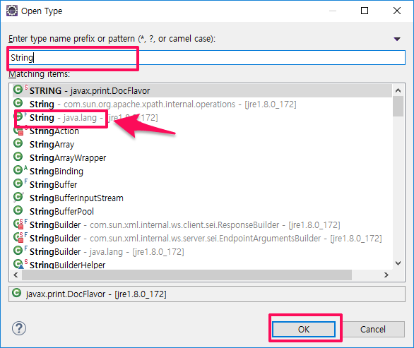 컴파일러 플러그인 설치가 끝났다면 이클립스에서 Ctrl + Shift + T 를 눌러 Open Type 검색 팝업을 열고 가장 많이 사용하는 클래스인 java.lang.String 클래스를 검색합니다.