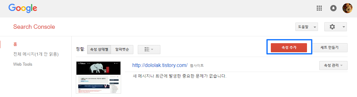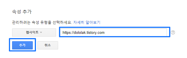 저의 경우에는 이미 제 블로그를 등록해 두었는데, 새로 등록하는 경우에는 속성 추가를 누릅니다.