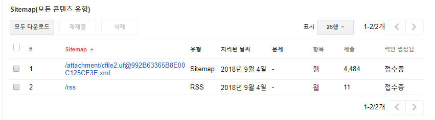 새로고침 하면 하단에 등록된 사이트맵 목록이 나타납니다. 접수중으로 나타나는데 며칠 내로 등록이 완료됩니다.