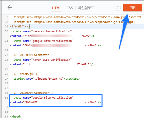 우측에 HTML 편집창이 나타나는데, 다음과 같이 </head> 태그 안쪽 아무곳에나 아까 복사해 두었던 메타태그를 붙여넣기하고 저장합니다.