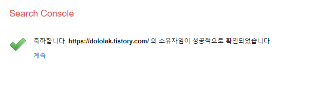 Google Search Console 봇이 블로그에 등록한 메타태그를 참고하여 소유자임을 확인 했습니다. 계속을 클릭합니다.