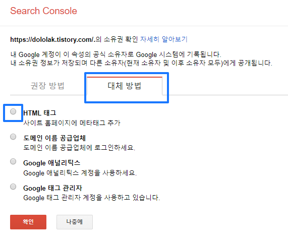사이트 소유권 확인 화면이 나타나면 대체 방법 > HTML 태그를 클릭합니다. 이 단계에서는 현재 등록하려는 사이트가 자신의 사이트임을 증명하는 단계입니다.