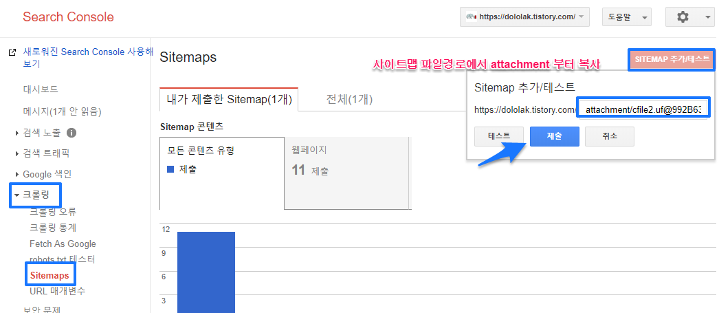포스팅을 참고하여 사이트맵 파일의 경로를 복사하셨다면 사이트맵 파일 경로에서 attachment 부분부터 붙여넣어 제출하시면 됩니다.
