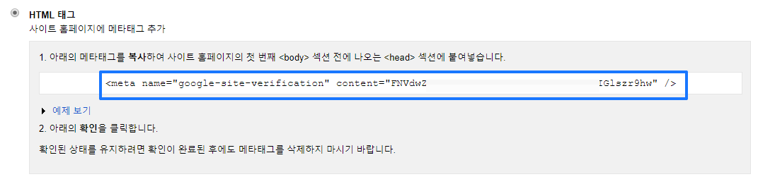 HTML 태그에 체크하면 다음과 같이 메타 태그가 나타나는데 이부분을 복사합니다.