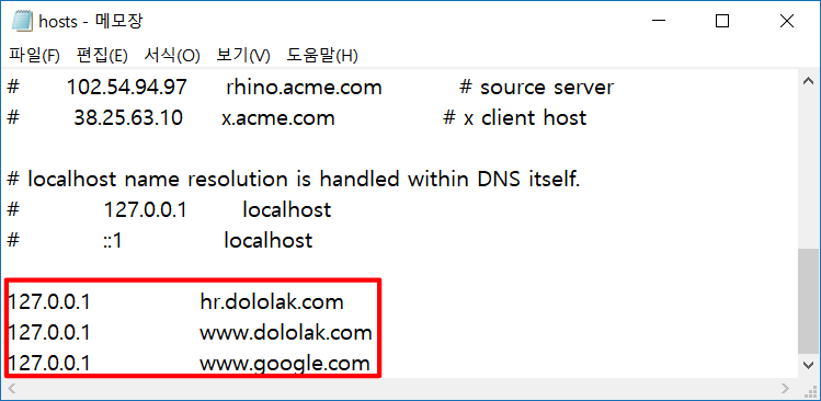 아래와 같이 설정하면 다음과 같은 세 도메인 주소를 브라우저로 접근할 시 모두 127.0.0.1로 요청하게 됩니다. 설정을 변경하기 위해서는 백신등의 실시간 검사가 꺼져 있어야 하며, 윈도우즈 관리자 계정인 Administrator 계정의 권한이 있어야 합니다. 보안과 직결되는 설정이기 때문에 권한이 필요하며, 백신이 감시하는 대상이기 때문입니다.