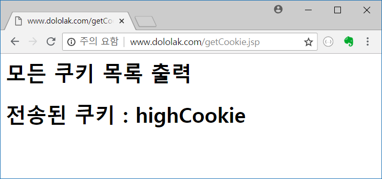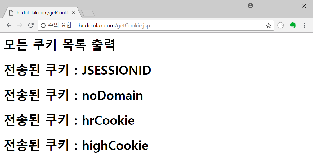 이번에는 생성된 쿠키가 전송되는것을 확인하기 위해 hr.dololak.com/getCookie.jsp로 요청합니다. 꼭 saveCookie.jsp를 요청했던 브라우저에서 그대로 주소창에 해당 URL을 입력해야 합니다. 쿠키가 브라우저 단위로 생성되기 때문에 새로운 브라우저를 실행하는 경우 쿠키 전송이 되지 않습니다.