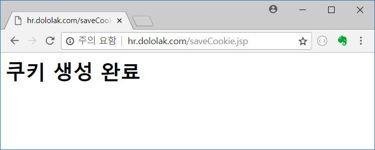 테스트를 위해 먼저 hr.dololak.com/saveCookie.jsp 을 요청합니다. 포트 번호는 자신의 톰캣 환경에 따라 입력합니다. 쿠키는 hr.dololak.com 서버에서 생성됩니다.