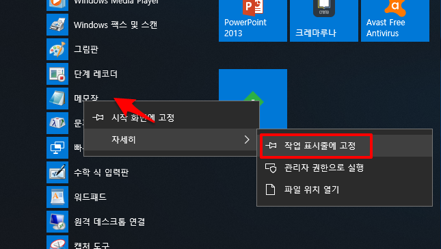 Windows10 자주 사용하는 프로그램 작업표시줄에 고정하기