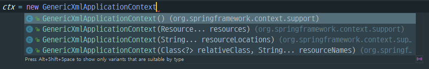 이후 Ctrl + Space를 누르면 여러가지 오버라이딩 된 생성자들을 볼 수 있습니다.