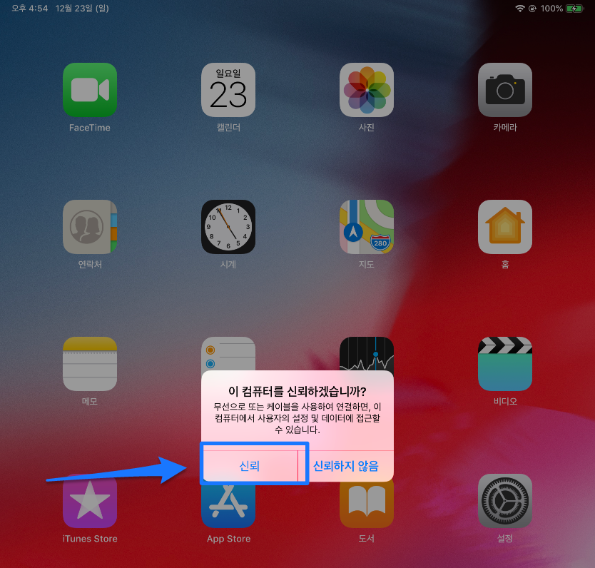가장 먼저 해야 할 일은 당연히 아이패드를 내 PC에 연결하는 것입니다. USB 포트를 통해 아이패드와 PC를 연결하면 아이패드에 다음과 같이 이컴퓨터를 신뢰할것이냐는 팝업이 나타나는데 신뢰를 터치해주세요.