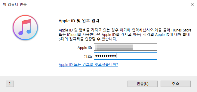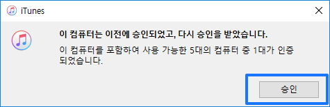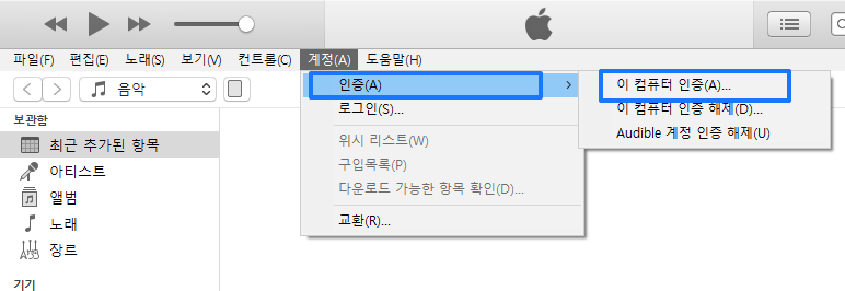 이후 아이튠즈 상단 메뉴에서 인증 > 이 컴퓨터 인증을 클릭합니다.