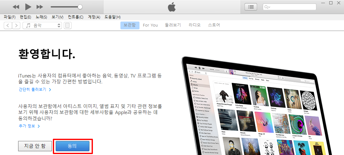 먼저 글 상단의 이전글 링크를 통해 아이튠즈를 다운로드 및 설치를 해주시기 바랍니다. 아이튠즈를 처음 실행하면 환영 문구가 나옵니다. 보관함 세부사항을 Apple과 공유할것인지의 여부인데 저의 경우 동의를 하였습니다. 본인의 의사에 따라 지금 안 함을 클릭하셔도 됩니다.