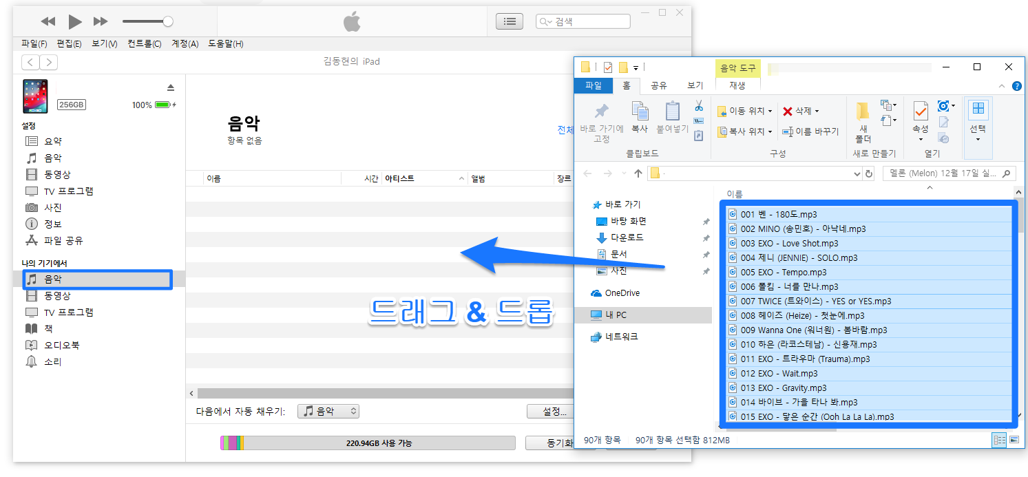 PDF와 마찬가지로 나의 기기에서 음악 메뉴를 클릭하고 mp3 파일들을 드래그&드롭 하여 옮겨줍니다.