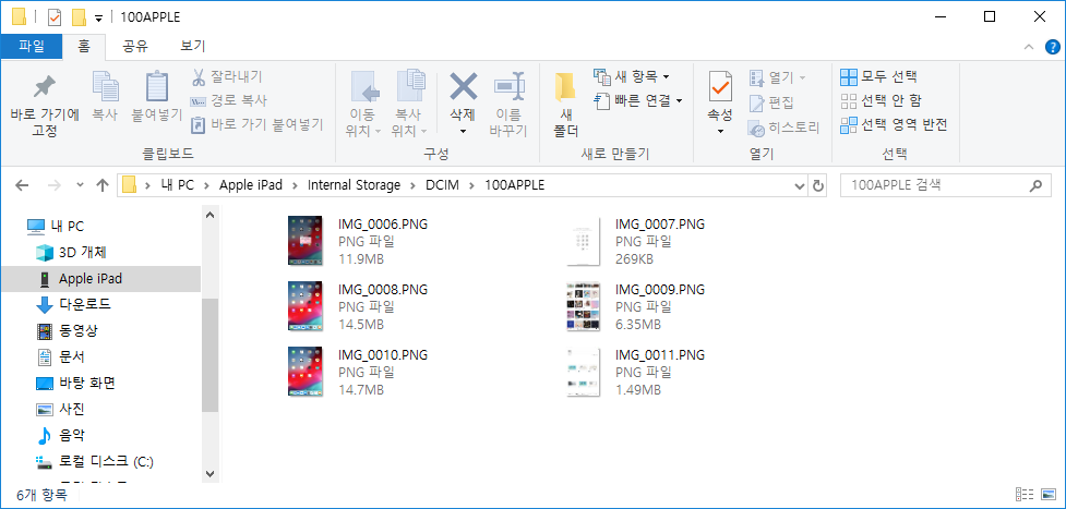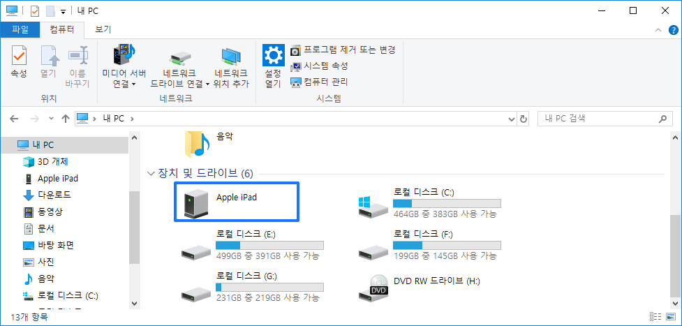 사진파일은 훨씬 간단합니다. 파일탐색기로 내 PC로 이동하면 Apple iPad가 드라이브처럼 연결되어 있습니다. 더블클릭하여 들어갑니다.