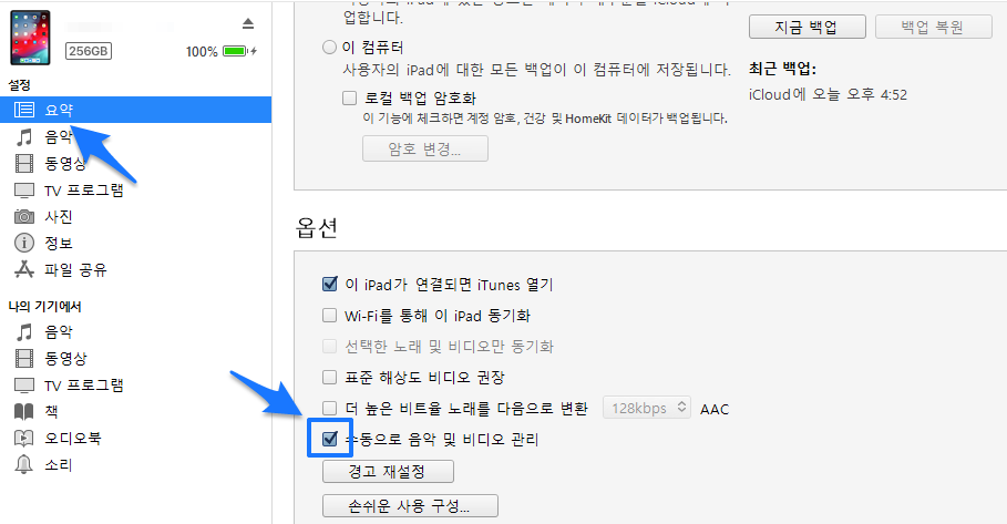 먼저 요약 메뉴에 들어가 수동으로 음악 및 비디오 관리에 체크합니다.