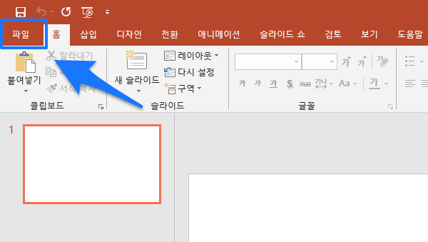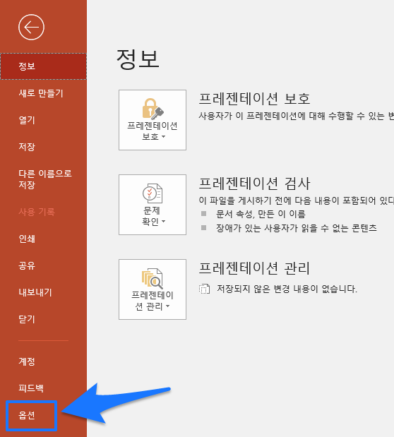 파일 메뉴에 접근하셨으면 옵션 클릭(파워포인트 버전에 따라 메뉴가 달라보일 수 있음)