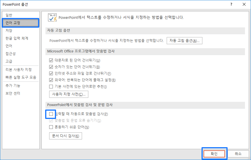 옵션 팝업이 열리면 언어 교정 → 입력할 때 맞춤법 검사 체크 해제 후 확인을 눌러 설정을 저장합니다.