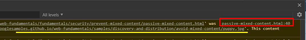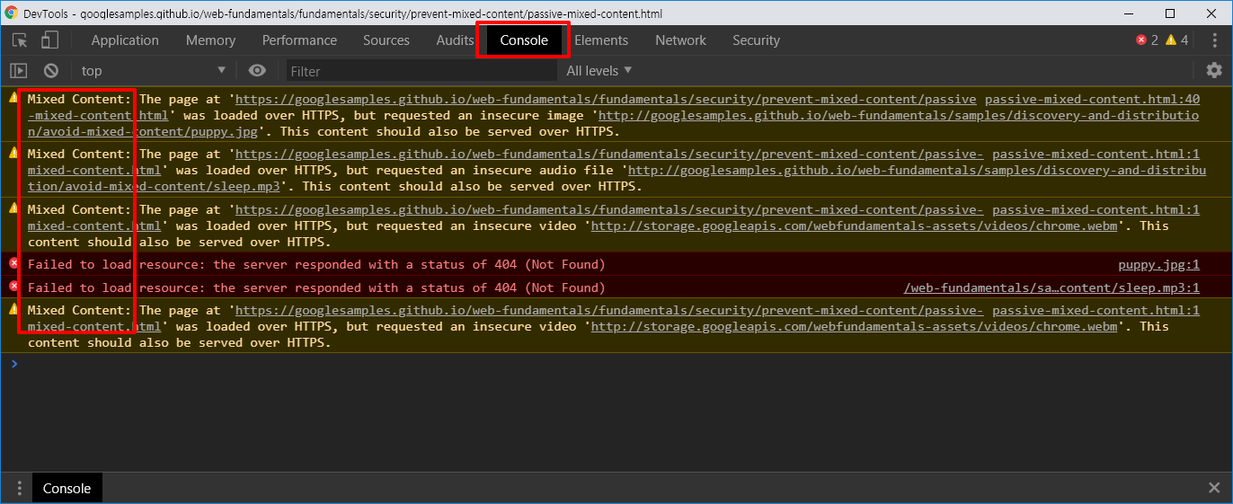 크롬의 개발자 모드(F12키로 접근)를 이용하면 혼합 콘텐츠를 분석할 수 있습니다. 즉 HTTP로 수신하는 자원들이죠. 크롬에서는 수동적 혼합 콘텐츠는 노란색으로 능동적 혼합 콘텐츠는 빨간색으로 보여줍니다.