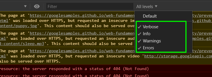 만약 혼합 콘텐츠 로그가 출력되지 않는 경우 로그레벨을 모두 체크해주시기 바랍니다.