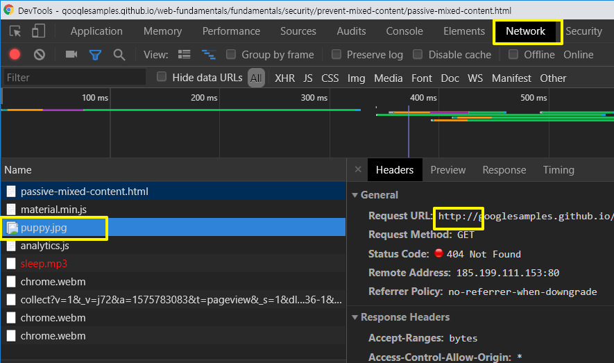 puppy.jpg가 http://로 통신했었다는것을 Network 탭을 통해서도 알 수 있다는것을 아래 캡쳐에서 보여줍니다. 404 Not Found인것을 보니 구글 샘플 서버에 이미지 파일이 없었나보네요.