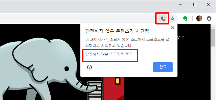 크롬 브라우저에는 혼합 콘텐츠의 위험성이 있는 사이트에 접속하면 다음과 같이 안전하지 않은 콘텐츠가 차단됨 이라는 아이콘이 나타나게 됩니다.