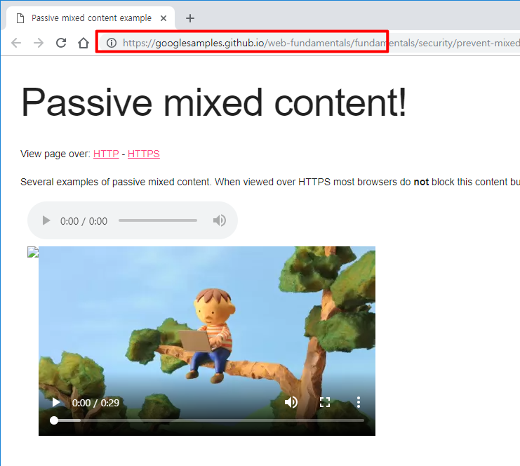 먼저 둘 중 하나의 샘플에 접근합니다. 보시면 알겠지만 URL 앞이 https://로 되어있는것을 눈치채셨을것입니다. 즉 HTTPS로 접속하는 것입니다. 저는 수동적 혼합 콘텐츠를 기준으로 설명합니다.