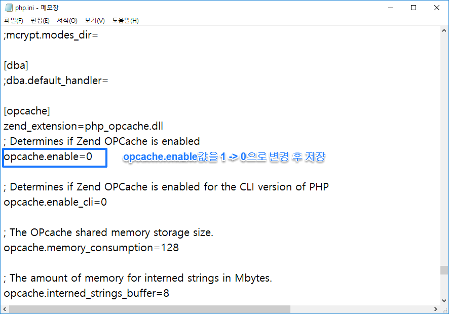 opcache.enable 값을 1에서 0으로 변경 후 저장합니다.