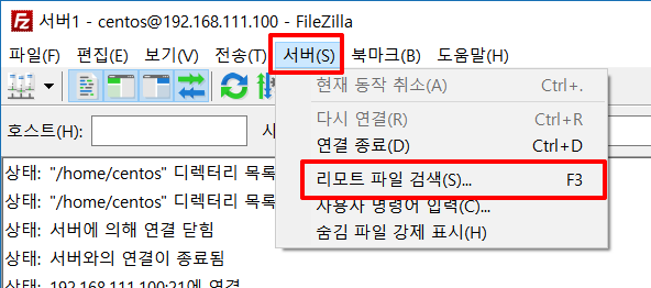 파일질라를 실행하고 파일검색 단축키 F3를 누르거나 상단 메뉴 서버 > 리모트 파일 검색...을 클릭합니다.