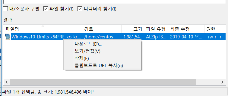 검색 팝업의 하단은 검색 결과 목록입니다. 검색된 파일들이 나타나며 마우스 우클릭하면 다운로드하거나 삭제하거나, 클립보드로 URL 복사를 클릭하면 해당 파일의 경로가 복사됩니다.