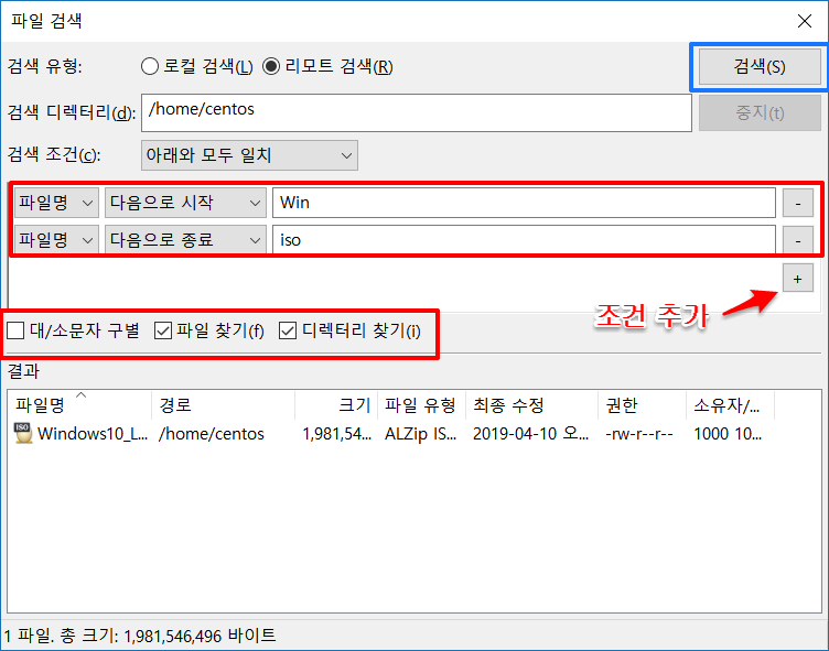 빨간색으로 표시한곳은 조건을 추가할 수 있는곳입니다. 파일명, 다음으로 시작을 선택하고 Win 으로 하여 검색하면 Win으로 시작하는 파일만 검색합니다. + 버튼을 클릭하여 조건을 여러개 추가할 수 있습니다. 대/소문자를 구별하여 검색할지 여부등도 설정 가능합니다.