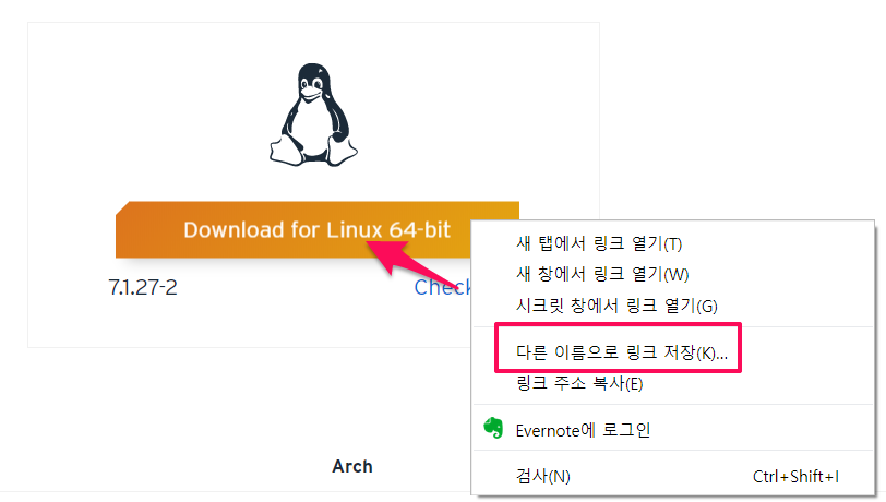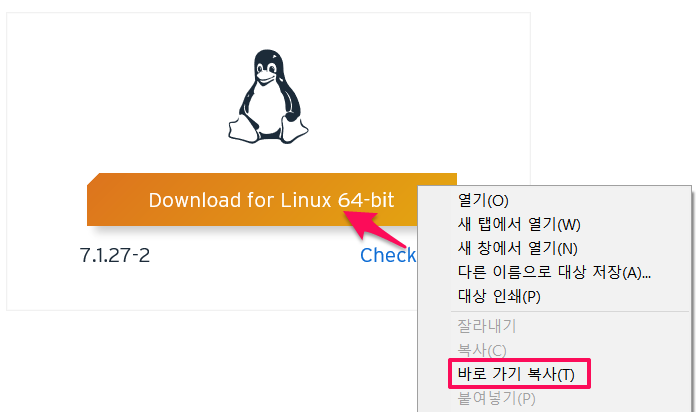 앞서 설명했던 직접 내려받기 2번 과정에서 Download for Linux 64-bit 버튼을 마우스 우클릭 하고 다른 이름으로 링크 저장을 클릭하면 다운로드 URL이 복사됩니다. (크롬 기준)