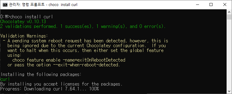 명령어는 choco를 사용합니다. curl을 설치해보도록 하죠.