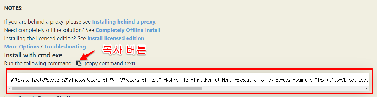 설치 방법을 알려주는 페이지가 나오는데, cmd.exe(명령 프롬프트)를 관리자 권한으로 열어 다음 명렁어를 통해 설치할 수 있다고 하네요.