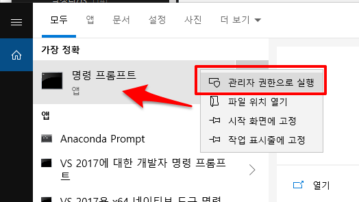 cmd.exe를 관리자 권한으로 실행합니다. 마우스 우클릭으로 실행 가능합니다.