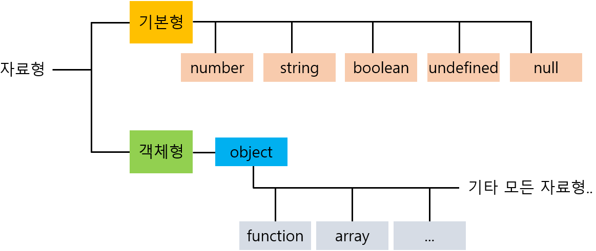 자바스크립트는 기본데이터 타입인 boolean, number, string과 null, undefined가 있고 이들을 제외하고는 모든 값들이 객체입니다. 자바스크립트에서의 null과 undefined는 그 자체로 값을 가지고 있습니다.