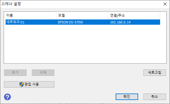 이후 스캔 프로그램을 실행하고 새로고침을 누르면 무선 네트워크에 연결된 스캐너가 나타나서 이용이 가능합니다.